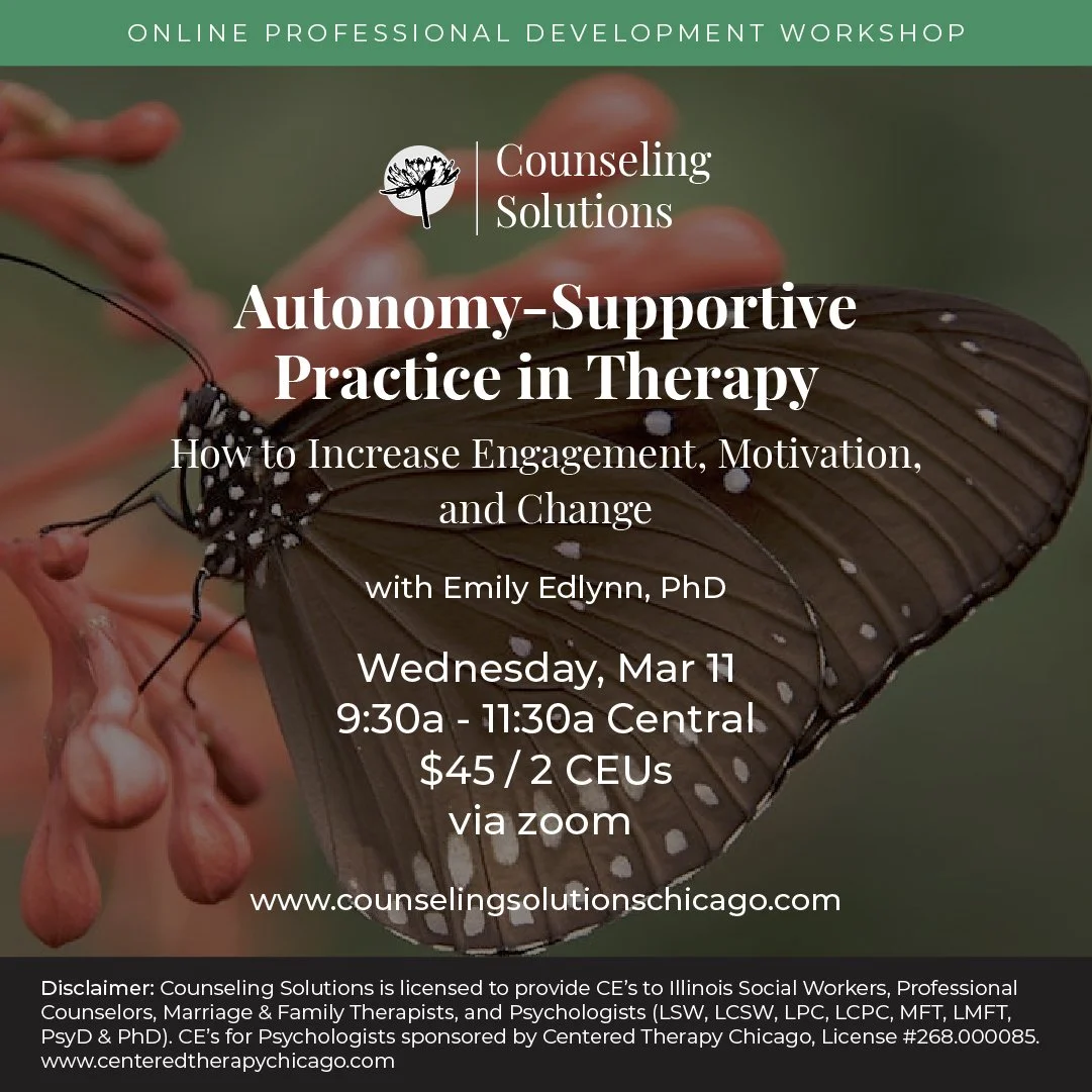 Disclaimer: Counseling Solutions is licensed to provide CE’s to Illinois Social Workers, Professional Counselors, and Marriage & Family Therapists (LSW, LCSW, LPC, LCPC, MFT, LMFT,). NOTE: For our "On Demand Trainings" we are NOT able to provide CE’s for Psychologists or therapists outside of IL.